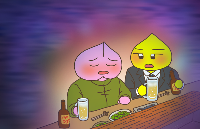 クリビーとモモビーは2人とも今、仕事が上手くいっていなく、バカらしい気持ちになっていました。居酒屋の中で2人の悲しい笑い声が響きます。