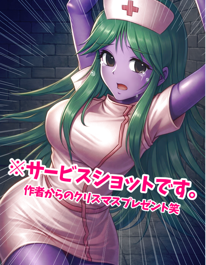 ナスミさんは箱の中で両手に手錠をかけられ、閉じ込められている様子です。まるで、脱出マジックショーの、ショーケースに入った見世物の美女です。(しかも看護師さん姿の・・・)作者の趣味入れてごめん。