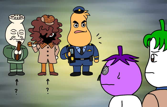 シロナス先生の通報により駆けつけたバターナッツかぼちゃのバターナッツ警部の他、事件のウワサを聞いた自称名探偵の舞茸のマイターケ氏と、自称よく当たる占い師の蓮根のハスーネ氏が捜査に協力したいと集まっていました。
