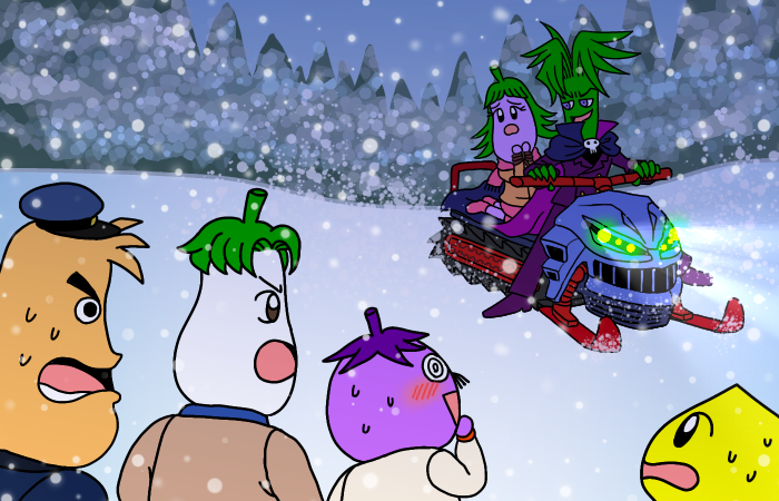 なんと、その黒い影の正体は、ナスミさんを人質として捕らえた、ニラッチ博士の乗るスノーモービルでした。