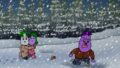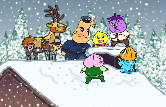 ニラッチ博士はスノーモービルで雪山の中へと逃走してしまいました。続いてシロナス先生はトナカイロボに乗り、ニラッチ博士を追いかけます。