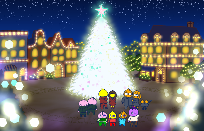 そのイルミネーションの美しいクリスマスツリーの前には、クリビー、モモビー、ネギーンの、それぞれの両親が待ち構えていました・・・。それはそれは、恐ろしい顔をして・・・。