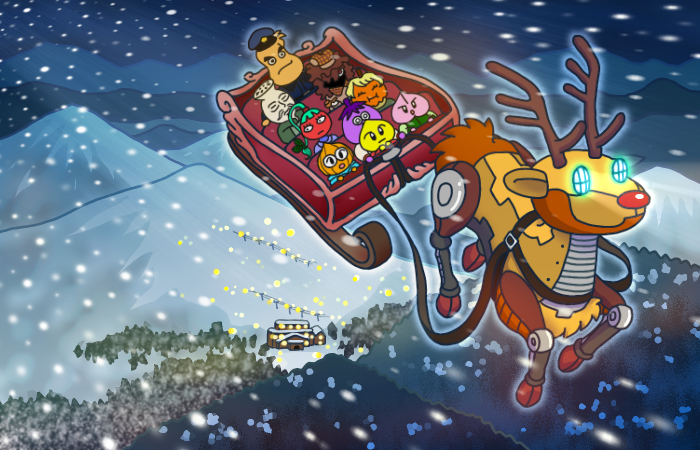残りのマルナス、クリビー、モモビー、ネギーン、チャコ、チェリ子、マイターケ、ハスーネの8人はデラックスタイプのトナカイロボの率いるサンタのソリに乗って帰りました。
