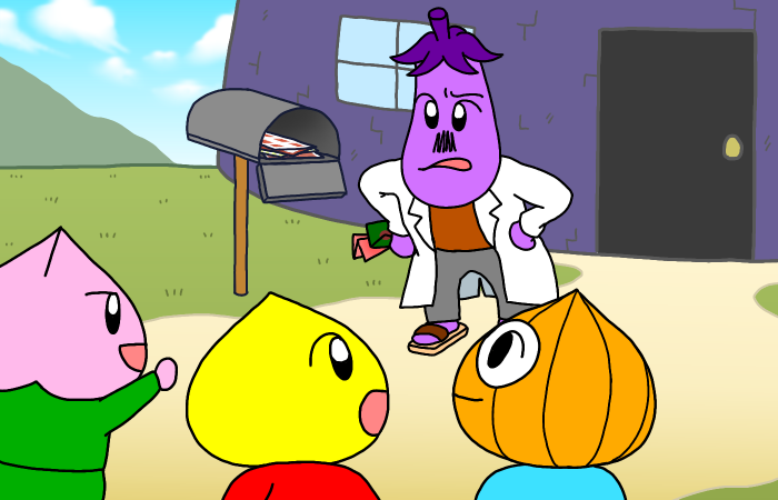 何やら1人で笑い出したナスビー博士・・・気持ちが悪いので、マルナス助手も、クリビーたち3人もドン引きです・・・。