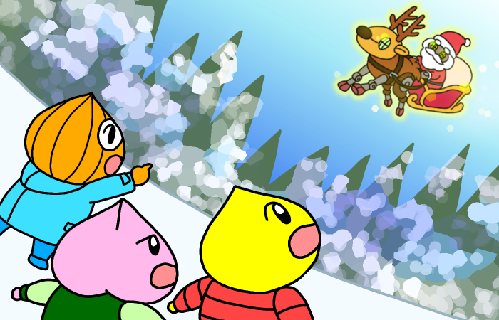 ネギーンが指さす方向の空を見上げると、なんと、トナカイが引くソリに乗ったサンタクロースが空を飛んでいました。